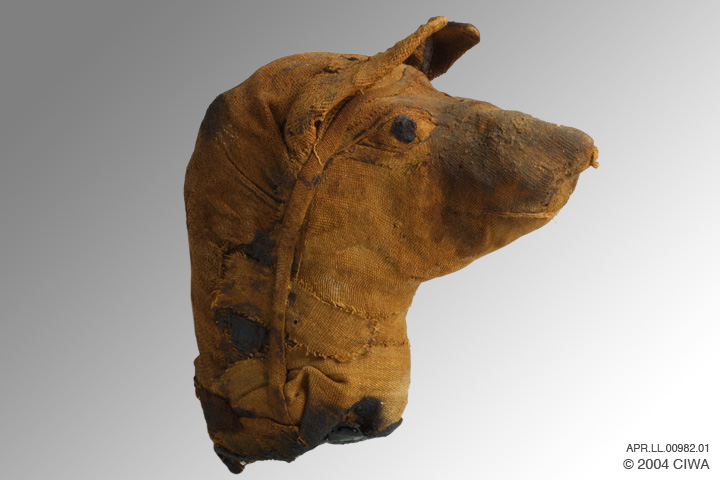 This is the mummified head of an Egyptian dog, which may have been a household pet. The linen wrappings are intact, carefully draped and stitched to suggest the eyes and mouth of the animal. The iris of the eye is marked with black pigment. Similar embalming techniques can be seen on a Roman Era dog mummy at the British Museum (EA 6743).
