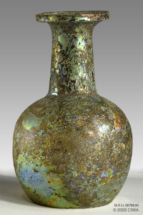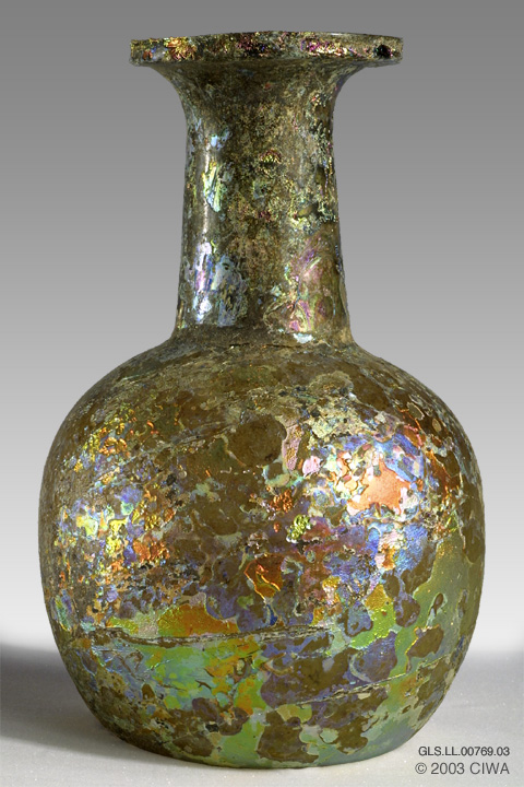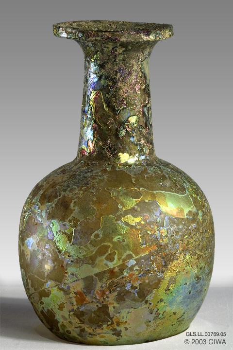 When a glass bottle is new, there is no such thin film. The wall of the bottle is homogenous. But as glass is exposed to water in its burial environment, some of its [chemical] components can be dissolved by the water and carried away (leached out). This generates a thin surface layer of glass that has a different composition that the undegraded bulk of glass. Often, there is a think layer of air between the corroded surface and the bulk (Bezúr 1999).
