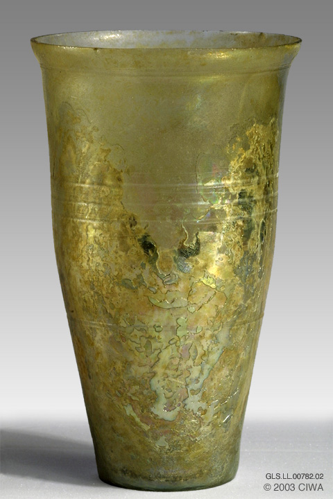 This tall, elegant beaker was blown from transparent glass with a slight yellow-green cast. The bottom is perfectly smooth, with a slight depression, but no visible pontil mark. The body is generally a truncated cone, with gentle flaring for the bottom half, and almost straight sides for the top half. The rim presents an s-shaped profile with a perfectly horizontal ground edge (the edge exhibits pitting and weathering, confirming that this is not a newly exposed surface). The outside surface is decorated with five horizontal cut grooves: single grooves below the rim and in the lower third of the body, and a band of three equidistant grooves two thirds up the side wall. Beginning of the Roman Empire, from Emperor Tiberius. Rome, 14-50 AD.