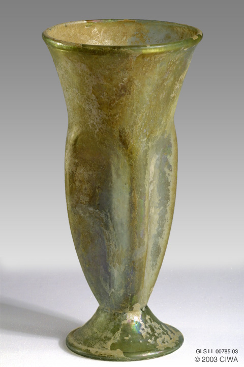 Beaker with indentations. Ht. 15 cm. Pale yellow-green glass. This tall beaker is decorated by ten irregularly tooled indentations. Dark weathering crust adheres to surface, a spall at the base is still intact (Fortuna 1991:36 #50).