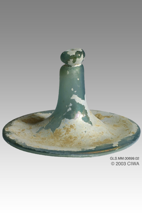 This transparent blue glass lid was made to close a Roman urn containing human remains. The slightly concave top surface is raised, peaking in a pinched knob.
