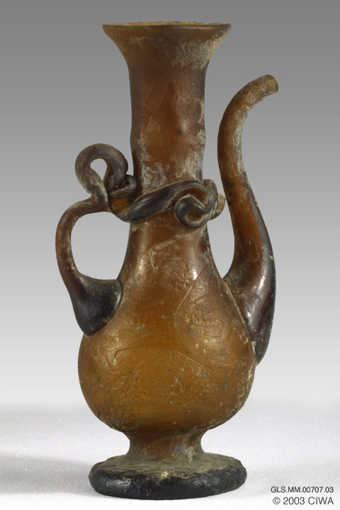 This classic example of Islamic glass work from the IXth century was crafted in Syria from dark amber translucent glass. It presents a thick, solid flat foot with tool marks on top, and a pontil mark on the bottom. The pyriform body meets, in a telltale swelling, a neck that was made a little too wide. The coil handle was applied to the shoulder, pulled up, looped, then attached to the base of the neck, forming a frilly neck coil. The s-shaped spout is functional. Flaring mouth, everted rim.