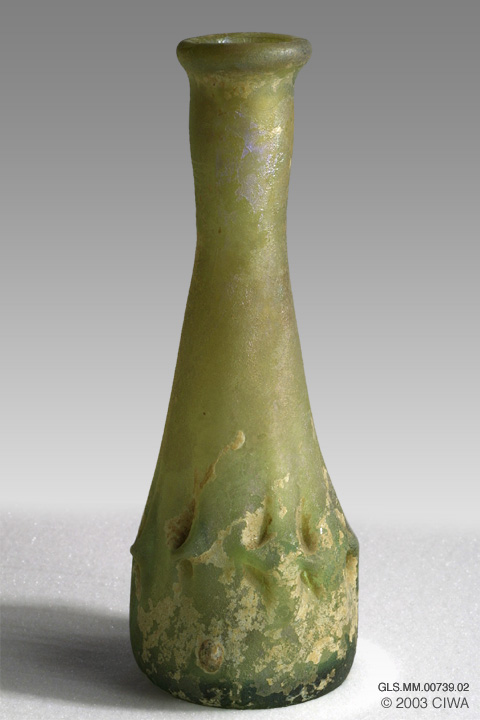 A small receptacle for toilet preparations (e.g.: oil, scent, kohl). They were made of glass in numerous sizes (usually from 3 to 16 cm. high) and forms. Some examples made of core glass are in the form of various types of Greek vases (e.g. aryballlos, alabastron, lekythos, ampulla) and have combed decoration. Others of the Roman period were of coloured or colorless glass and were of spherical or conical shape, with a slender neck