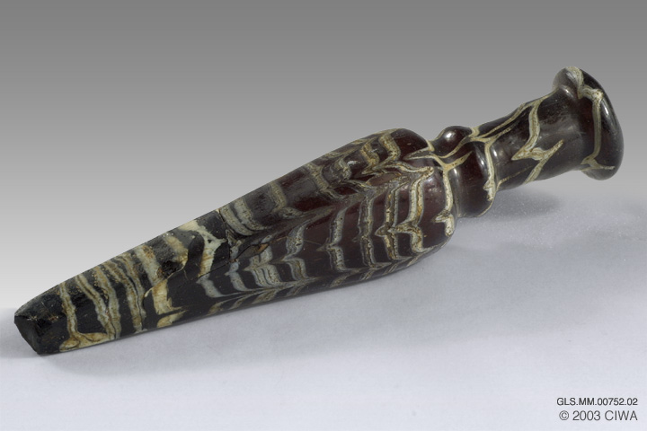 Bottles of this shape, used for kohl, are common in collections and among the excavated material. A relatively large number of such vessels have come to light, for instance, in the excavations at al Tur in Sinai. One bottle still contained kohl and a bronze applicator (Israeli 2003:382).