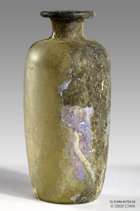 Beneath its grayish weathering coat and exposed iridescence, this bottle was blown from clear glass with a slight orangy yellow cast. The bottom presents a slight concave depression. The sober, elegant body shape is roughly cylindrical, with slightly convex walls. After a sharp return and a horizontal shoulder comes a short neck cum mouth, with a crisp infolded rim. Syria, Eastern Roman Empire, 100-300 AD.