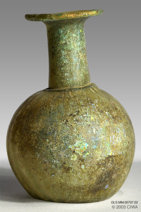 Under its lightly iridescent weathering layer, this glass sprinkler is blown from pale green glass. Beneath a short infolded rim and a wide flaring mouth, the straight neck meets the body with a constriction and a diaphragm. The subtle vertical ribbing on the spherical body was achieved by pattern blowing. The very top of the ribbing, which experienced the least inflation, shows the deepest grooves. The bottom is smooth, with a slight concavity and a pontil mark. Syria, Eastern Roman Empire, late third to early fourth century AD.