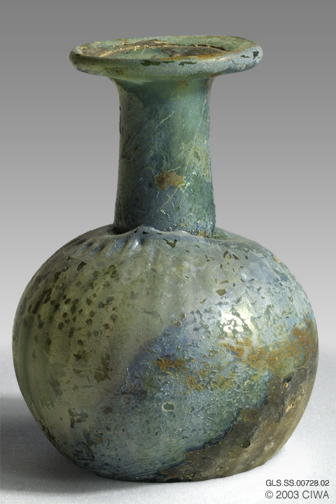 Ribbed sprinkler flask. Bluish-green glass. This flask has a spherical body with a concave bottom. The body has faint pattern-molded vertical ribbing and on the bottom a row of tooled finials which serve to stabilize the object. The tubular neck extends into a splayed lip with outfolded rib. At the base of the neck is a tooled constriction ring. Roman, 3rd. - 4th. century AD (Fortuna 1991:53 #86).
