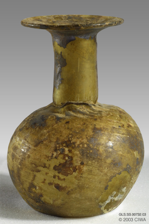 Sprinkler flask. Yellow-green glass. This flask made out of a thick glass fabric has a spherical body decorated with swirling horizontal ribs. The tubular neck flares out to a wide horizontal infolded rim. At the base of the neck is a tooled constriction ring. Patching of dark weathering crust. Eastern Roman Empire, 3rd. - 4th. century AD (Fortuna 1991:53 #85).