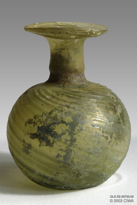 Sprinkler flask. Yellow-green glass. This flask made out of a thick glass fabric has a spherical body decorated with swirling horizontal ribs. The tubular neck flares out to a wide horizontal infolded rim. At the base of the neck is a tooled constriction ring. Patching of dark weathering crust. Eastern Roman Empire, 3rd. - 4th. century AD (Fortuna 1991:53 #85).