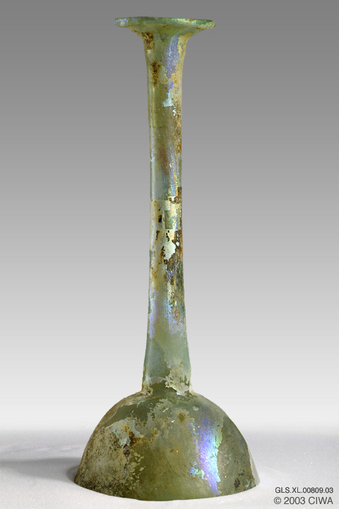 This unguentarium in the shape of a modern candlestick was made from pale green transparent glass. The bottom is smooth, with a deep concavity but no pontil mark. The hemispherical body is followed by a very tall straight neck, and a flaring mouth with an infolded rim. Probably Palestine, Eastern Roman Empire, 80-200 AD.