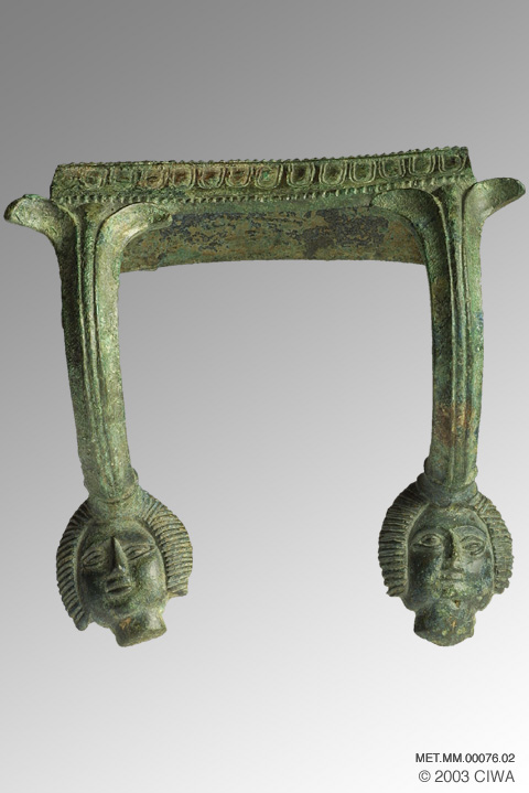 This elegant cast bronze artifact from the archaic period of Etruria was a double handle for a basin. Each stem of the handle depicts the head of a young woman wearing a wig, capped by a long leaf, widening at the top into a capital decorated with a frieze of medallions between two rows of pearls.