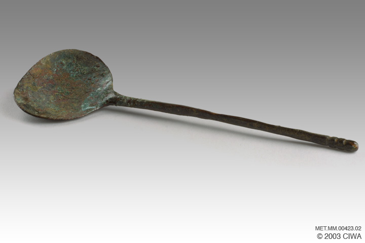 This bronze spoon has an oversized bowl and a very thin handle, terminated by simple ornamentation consisting of three incisions and a rounded end. Rome, 100-300 AD.