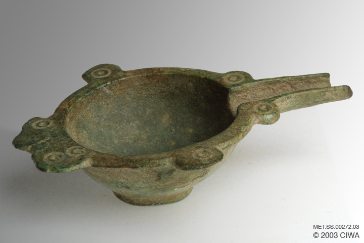 This bronze vessel with a long spout is decorated on the rim and handles with circular motifs. Such motifs were popular in Crete in the paleo-palatial period (2000-1700 BC), on diadems found in Mycenaean tombs around 1600 BC, and in ancient Iran, Gialon or Mozanderan, at the end of the second millennium BC (see numbers 1053, 1054, and 15 of this collection).