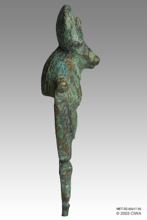 This aegis of the goddess Sakhmet on a lotus flower is the finial of a pin or staff, which may have been used in her worship. Her head is capped by a solar disc protected by the cobra. Her large collar is edged with the head of a falcon on each of her shoulders. Her inlaid eyes, probably stone, are now missing and only traces remain of the original gilding. She was most probably crafted at the end of the New Kingdom, Dynasty 20, possibly during the reign of Ramesses III.