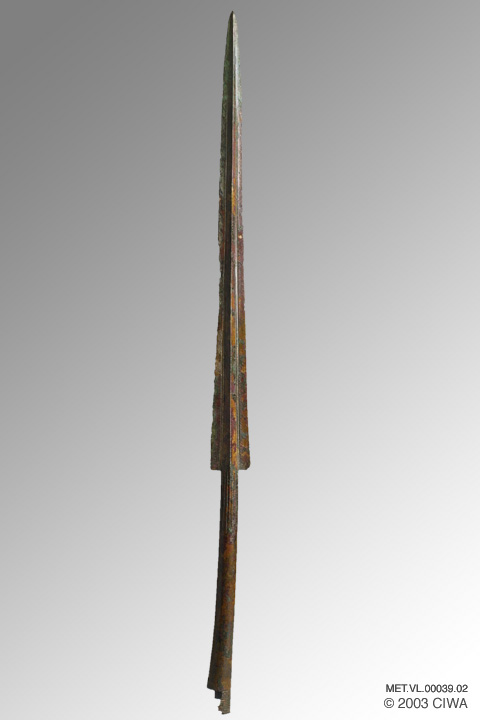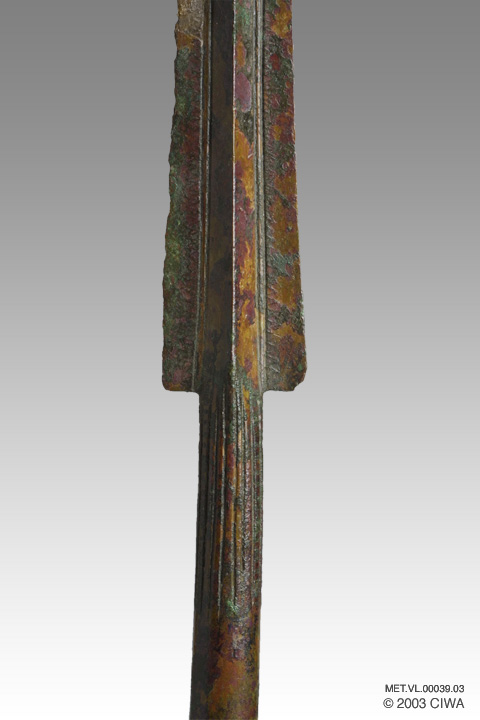 This large bronze spear tip features a pronounced central ridge and fine longitudinal grooves. The red, golden and green patina imparted by time is particularly attractive. Etruria, circa fourth century BC.