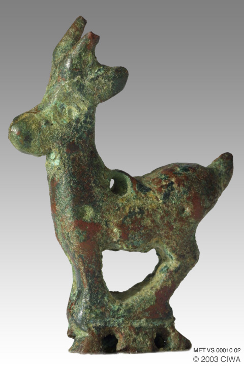 This small bronze ibex from Luristan features three attachment holes: one between the shoulders, and two under the hooves. It is similar to the four ibexes discovered by Ectabane (Hamadan) and brought by the French mission of Virolleaud and Fossey to the Cabinet des Medailles in Paris.