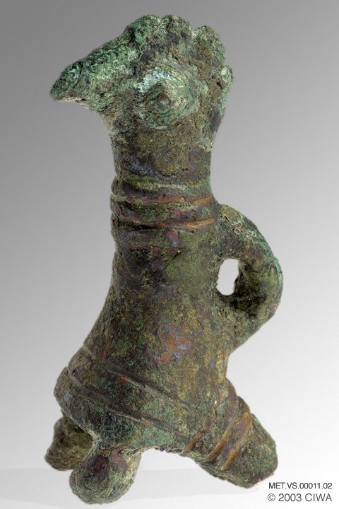 This amulet from Luristan is an extraordinarily modern-looking rendition of a bird. Above and below the attachment ring, two deep incisions (around the neck and above the legs) balance out a design echoed by the three rings around the tail.