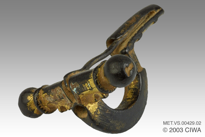 This gilded bronze crossbow fibula was made in Byzantium around 400 AD. Although in good overall condition, it has lost its third knob.