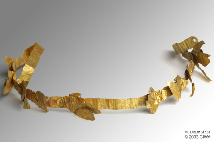 This gold wreath with simulated leaves is made of paper-thin gold, demonstrating the extraordinary ductility of gold which ancient craftsmen understood and exploited to their advantage. The fragility of construction with no reinforcement at stress points, and the lack of wear marks (particularly around the holes intended for lacing) suggest that this was a funerary wreath. Mycenae, 1400-1200 BC.