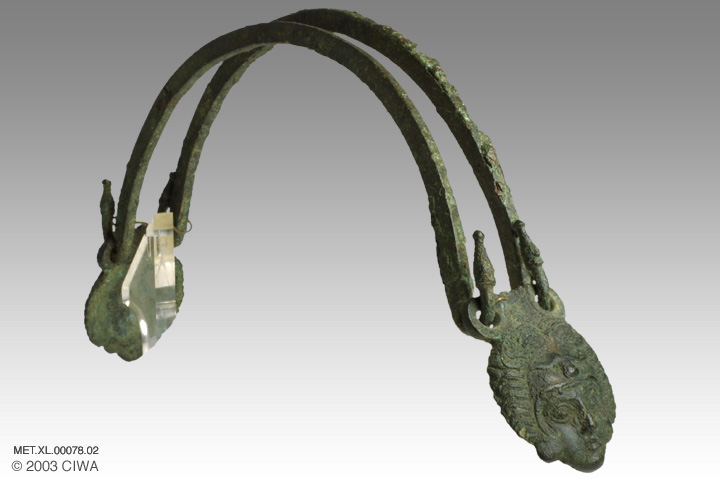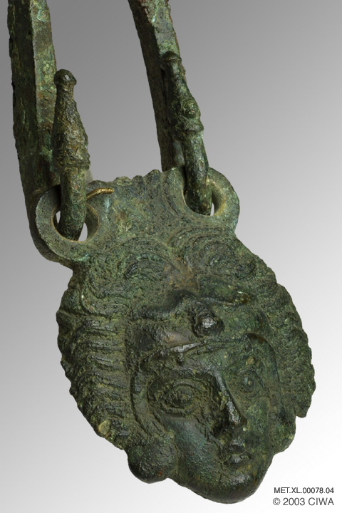 The type of head-dress and the facial appearance of the women pictured on the medallions date the work to 680-640 BC (Bianchi Bandinelli 1973:Plate 160). A similar handle system is shown in Marcadé (1973:Plate 30).
