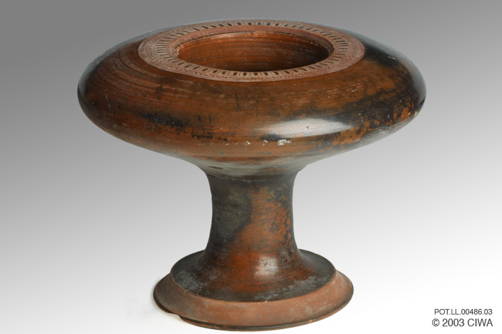 . . . An important feature on this vessel is its deeply turned-in rim, probably intended to prevent liquids from spilling. . . Perfume and oil were both used commonly in bathing, and perfume was especially significant in religious ceremonies. Vessels of this shape frequently are depicted on vase painting, where it occurs among the offerings brought by women to the grave. For an example on a pyxis see: Staatliche Museen, Berlin, no. 3373. From this evidence it is safe to say that the function of this vessel was to contain perfume, for both personal and ritual use. Terra cotta examples occur from the late sixth century, and last for quite some time, as it frequently is represented on vase paintings which date from the second half of the fifth century B.C. There are also examples of vessels with this shape worked in marble. . . Athenaios, 11.496 a, b, defines the plemochoe as a terra cotta vessel shaped like a top standing on a steady foot. Athenaios continues and states that it was used during the Eleusinian Mysteries when, on the last day they filled two plemochoai and set them up one to the east, one to the west, and then overturned them, saying mystic words as they did so. (Crane, Gregory R. ed. The Perseus Project, http://www.perseus.tufts.edu, August, 2004)