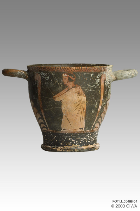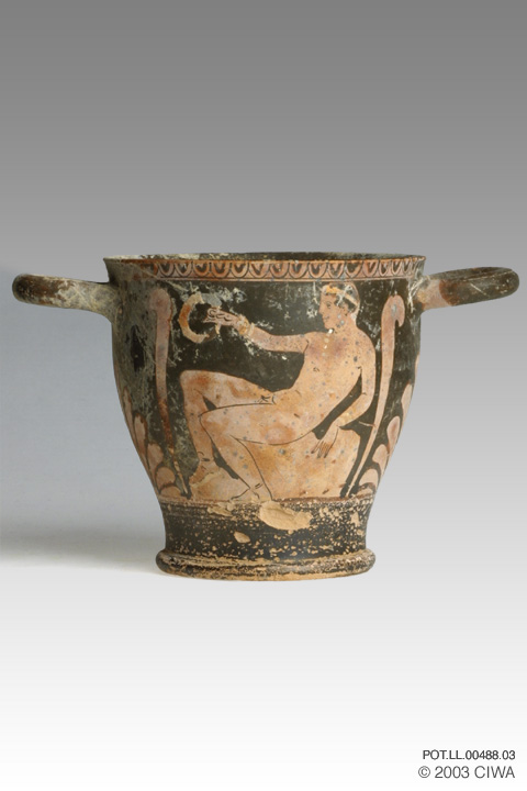 Red figure skyphos (a deep wine cup on a low foot), Athens, Greece, 470-430 BC. On one side, a seated kouros (young man) brandishes a laurel wreath; on the other side stands a kore (young woman).