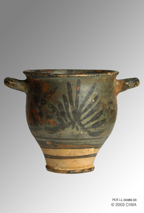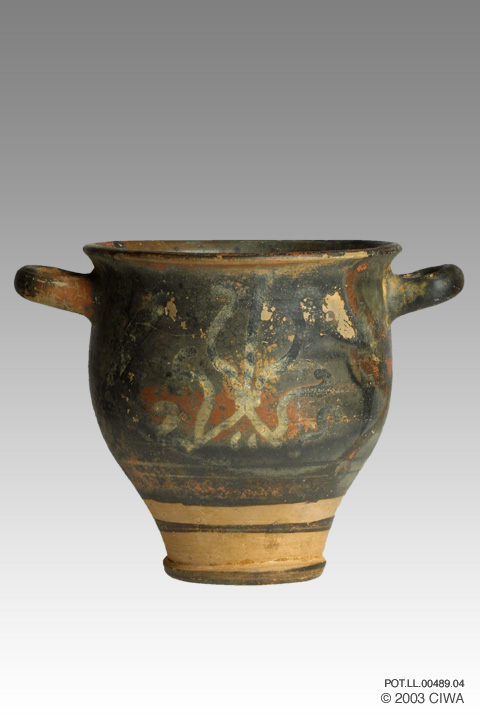 This dark skyphos (a deep wine cup on a low foot) presents a black on black palm and sea creature motif. To provide an interesting contrast, the artist left the lower part of the cup unglazed. Athens, Greece 575 - 550 BC .
