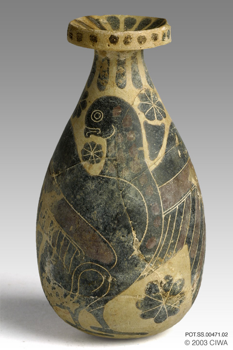 Pyriform aryballos (a form of pottery used to contain oils and perfumes). Greece, Corinth, 7th century BC.