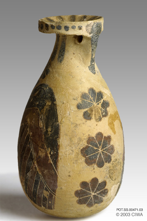 These perfume vessels offer a narrow neck and a wide lip which could be used to spread the fragrant oils on the skin. They are typical of Corinthian ceramics (Spiteris 1965).