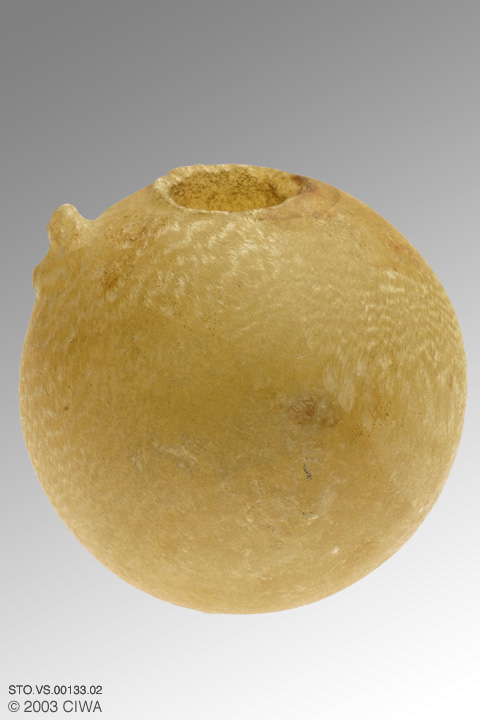 Schlögl (1978:31, Fig.108) describes a similar item as: alabaster, Old Kingdom, intact vessel, spherical shape, with a narrow and vertical opening. Spherical vessels were mostly used for libations, and were filled with water or wine. Hieroglyphs incorporate this style of vessel as the phonogram nu.