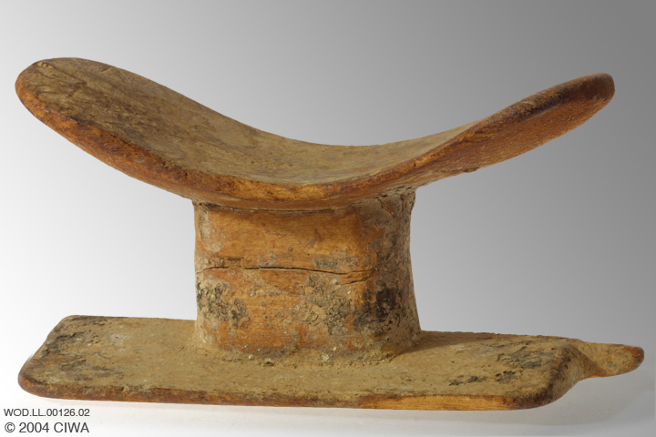 While they slept, ancient Egyptians rested their heads on low wooden or stone supports. The fundamental design form of the Egyptian headrest -a flat base, a straight shaft, and a neckpiece curved to accommodate the head- appeared as early as the First Dynasty (ca. 3100-2890 BC.) and continued through the Ptolemaic Period. Similar headrests are still manufactured in West Africa (Russmann 2001:162).