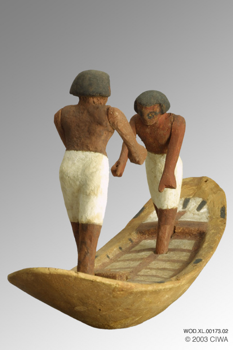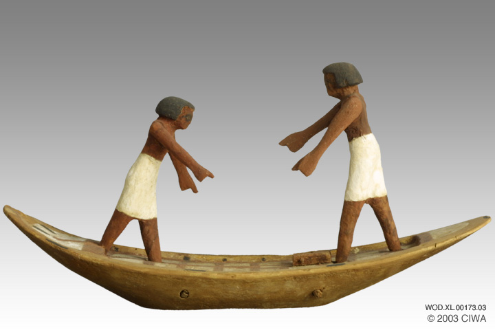 In this model of a fishing boat in a good state of preservation, the men are tending to the boat. Middle Kingdom, Dynasty 11.
